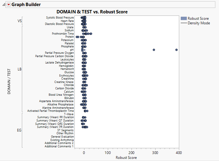Shows a contour plot used to determine outliers for each findings test across all study sites. Tests are grouped by domain. Testss are listed on the Y-axis and robust scores are plotted on the X-axis.