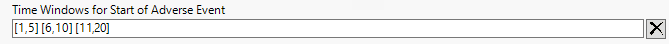Each must be expressed in the form [s1,e1] [s2,e2] ... where sx is a numeric start time and ex is a numeric end time. The time unit can be days or weeks as specified in the Time Scale parameter below. Each time point is relative to the reference start date for each subject.