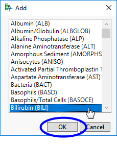 | 8 | Select the designation for the bilirubin test and click to add the test name to the text box. |