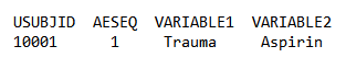 This option enables users do their own programming and make variables available to the narrative template. The supplemental data set merges events using USUBJID and AESEQ. If AESEQ is not available in the original SDTM/ADaM data, AESEQ is defined after sorting events by USUBJID, AESTDTC, and AETERM for events where AETERM is nonmissing. This feature allows the user to merge on any data for each AE.