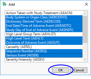 In this example, AEBODSYS, AEDECOD, AEENDTC, AEENDY, AEHLT, AEOUT, AESEQ, and AESER were selected and added.