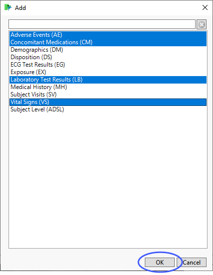 Use this option to include any SDTM or ADaM domain, with the exception of SUPP domains, RELREC, and trial design domains, in your output.