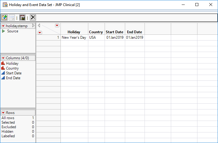 When you clicked on the Manage Holiday and Event Data Set... link on the settings page, the editable Holiday and Event data set opens, shown below: