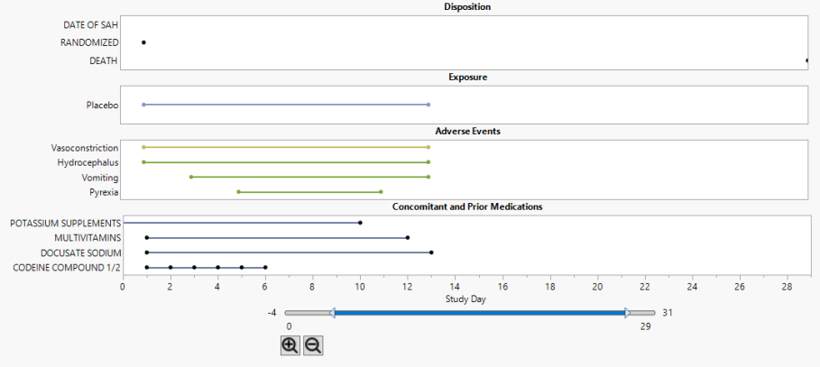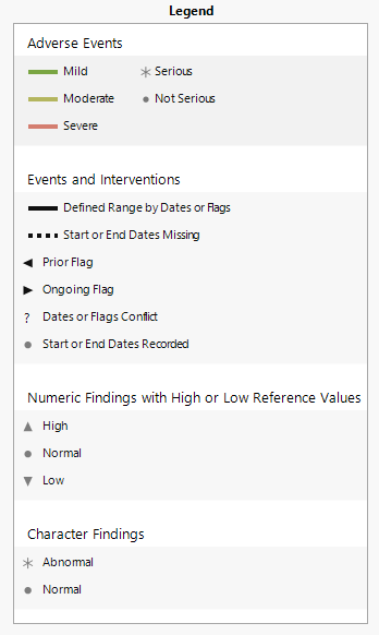 The top panel (shown below) denotes symbols and colors used for adverse events. Blue, green, or red bars indicate that the events are mild, moderate, or severe, respectively, as specified by the values in the SDTM variable aesev
