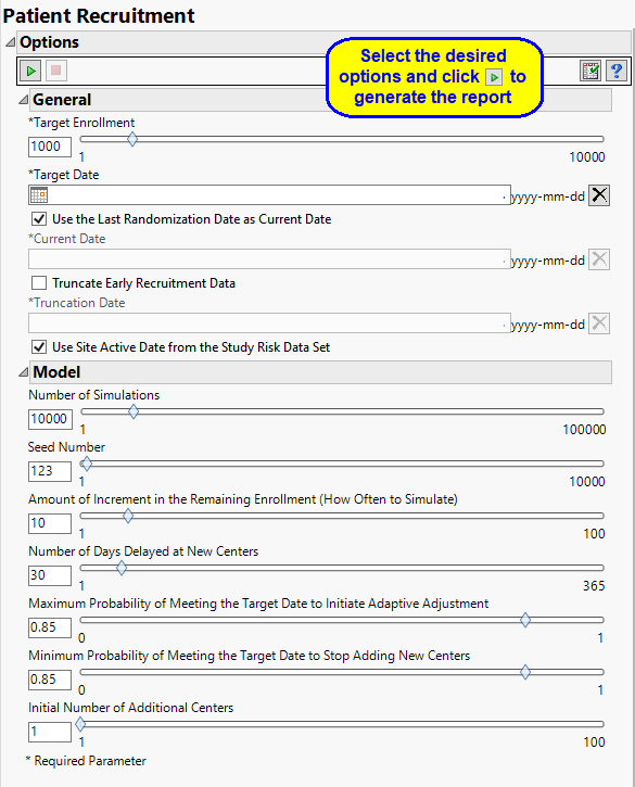 Use the Last Randomization Date as Current Date, Current Date, Truncate Early Recruitment Data, Truncation Date, Use Site Active Date from the Study Risk Data Set