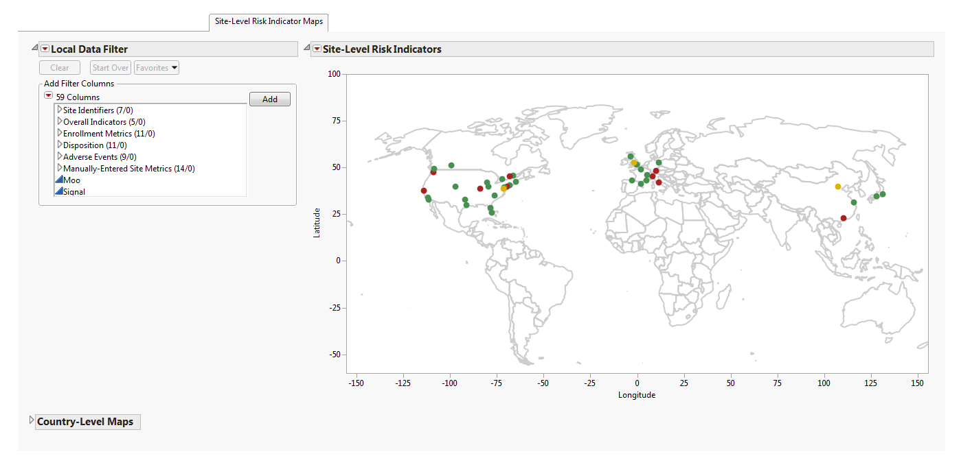 | • | Maps: A global map is provided detailing the location of clinical sites based on the available geocoding. The colors of the site markers are based on the risk indicator selected from the Risk Indicators down. These colors enable you to identify if a risk is attributable to specific locations. Maps at the country level are available for the United States, Canada, France, Germany, Great Britain, Italy, Spain, China, and Japan. Note: Maps are provided only for these countries if they are present in the study database. |