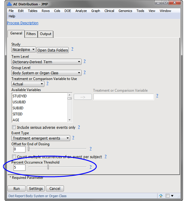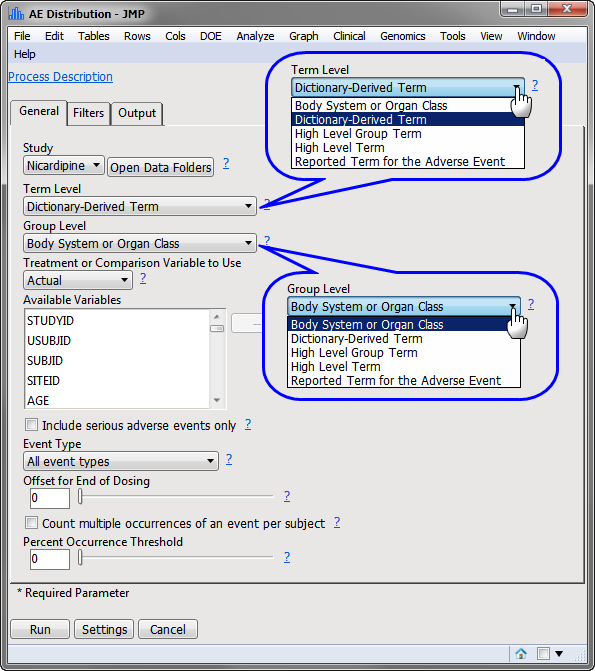 The Adverse Events Distribution dialog (shown below) enables you to use the term level and group level that are available in your ae.sas7bdat data so that while AEDECOD and AEBODSYS are specified by default variables in the examples shown here, this specification can be customized based on the term levels available in the given Study.