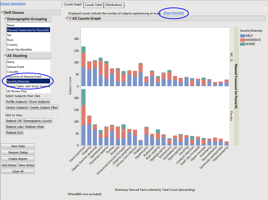 Example 3: Using the action button on the Output dashboard, select Planned Treatment for Period 1 for Demographic Grouping and Severity/Intensity for AE Stacking and examine the Counts Table tab. Note how the values change.