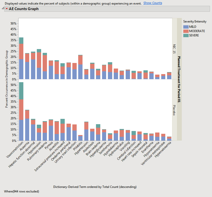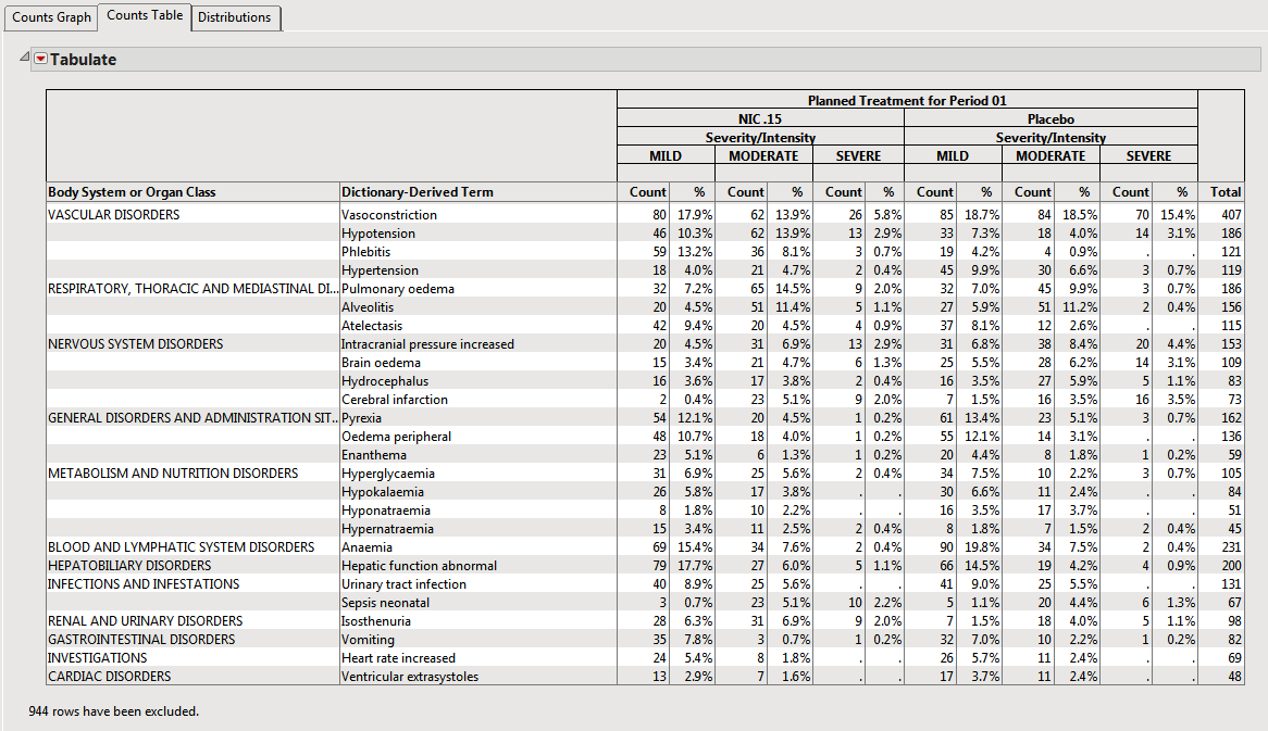 For example, if you run the Adverse Events Distribution report using the Nicardipine example that is shipped with JMP Clinical and select Serious Event using the AE Stacking action button, you see the following Counts Table.