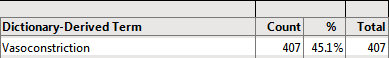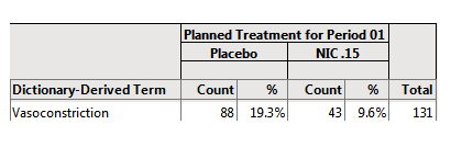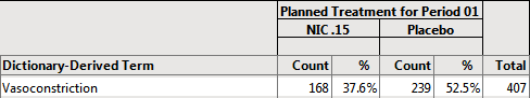 In this example, the 455 subjects on placebo make up the denominator of the percent calculation. The females showing vasoconstriction represent the subject count (or numerator) that had the event subject to any data filter specification (206 female subjects that had vasoconstriction).