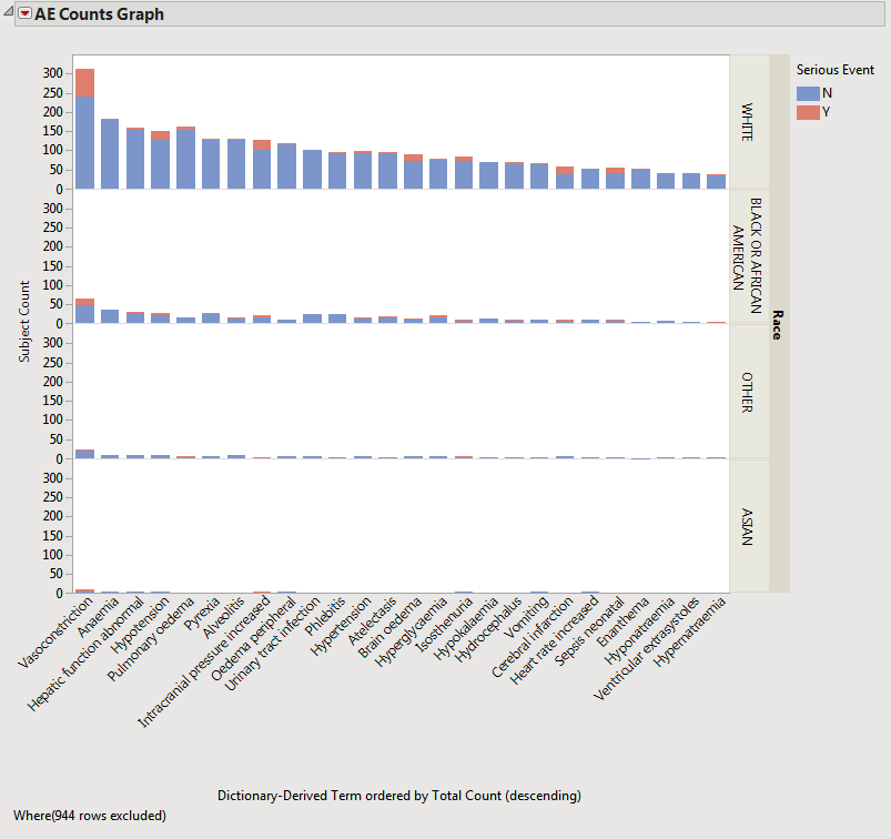 Note: JMP Clinical assumes accordance with controlled terminology: "Y" to represent severe events, and "MILD", "MODERATE", "SEVERE" to select the serious, most severe event as representative.