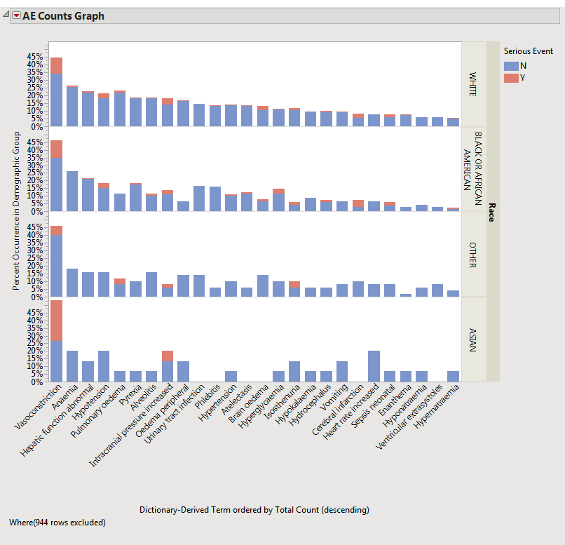 The value of percent calculation comparison can be seen clearly in the two plots shown below. The first plot shows the AE Counts graph grouped by RACE and categorized by Serious Event.