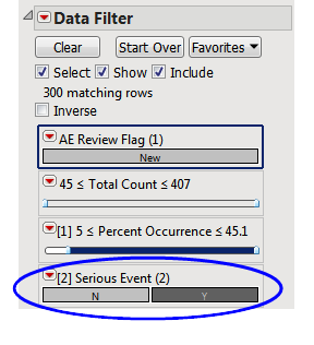 You can also use the Include the following adverse events: and Filter to Include Adverse Events options based on user-customized condition and/or on new/modified/stable records (when JMP Clinical snapshot comparison is being used)