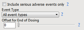 Three parameters, Include serious adverse events only, Event Type and Offset for End of Dosing, are used to specify a domain filter.