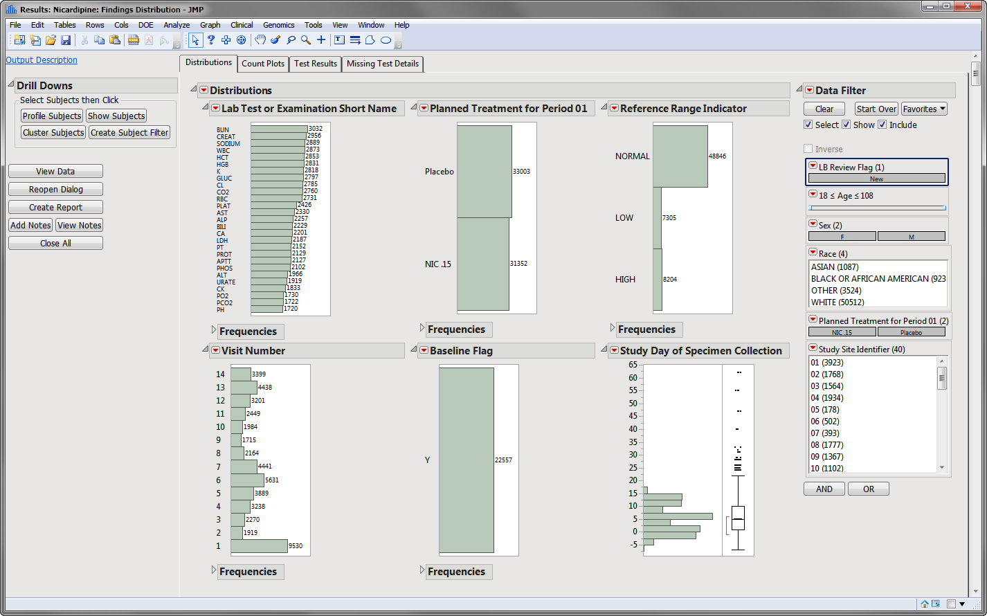 You can select the numbers in these tables and use action buttons to drill down to see profiles or lists of subjects that have missing records or missing measurement values. The Nicardipine results of counts of subjects for whom the tests were not recorded is shown.