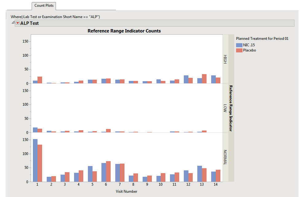 | • | Count Plots: Contains graphs for each test to display measurement counts within categories of the Reference Range Indicator variable. This tab is displayed only if the xxNRIND variable is present in the Findings domain data (typically the LB domain). |