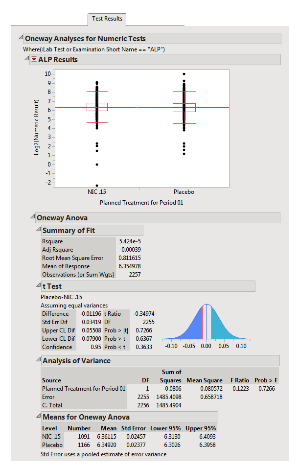 | • | Test Results: Contains One-way Analyses (ANOVA) for each test that has numeric measurement results (xxSTRESN values), Contingency Analyses for each Findings test that has character results (xxSTRESC values but missing xxSTRESN values), or both. |