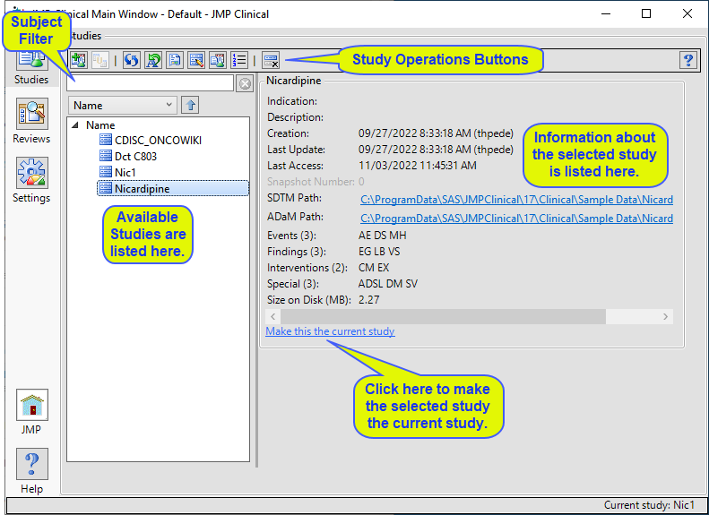 Information about the selected study is shown in the panel on the right side of the window. This includes the date the study was created, when it last updated and when it was last accessed. Additionally, the location of the study data within your file structure is shown along with a list of the domains that make up your study data. In the Nicardipine study shown above, there are 3 events domains (AE, DS, and MH), 3 findings domains (EG, LB, and VS) 2 interventions domains (CM and EX), and three special domains (ADSL, DM, and SV).