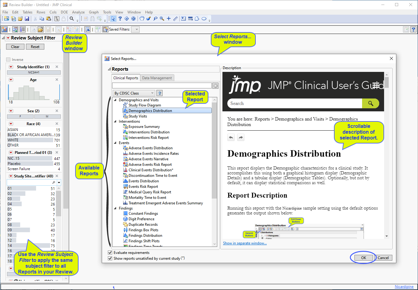 The Select Reports... window lists all of the reports that are available for analyzing the specified study. This window is used to select the reports that are to be included in the review.