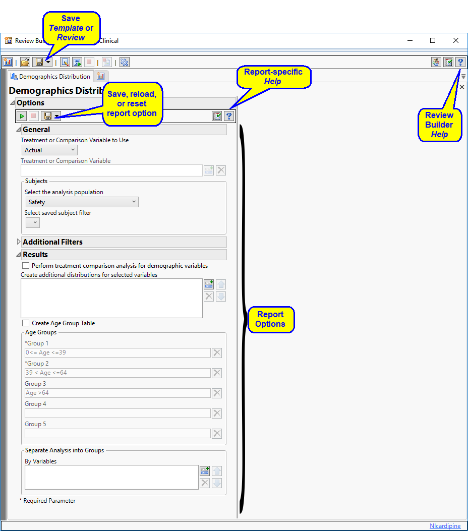 Save: There are two Save action buttons. The first is a review-level option that surfaces a drop-down menu that enables you to save either the template for the current review or the review itself. The second enables you to save the current option settings as the default selections for the report, reload any saved options, or revert to the factory-specified option settings.
