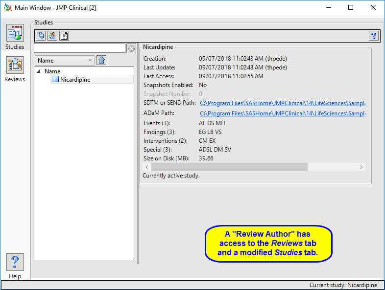 The review author has access to a modified Studies window where they can select a study, view its snapshot history, and explore the subjects in the study. Review authors can access all functions on the Reviews tabs and author new reviews and open existing reviews. The Settings tab is not available.