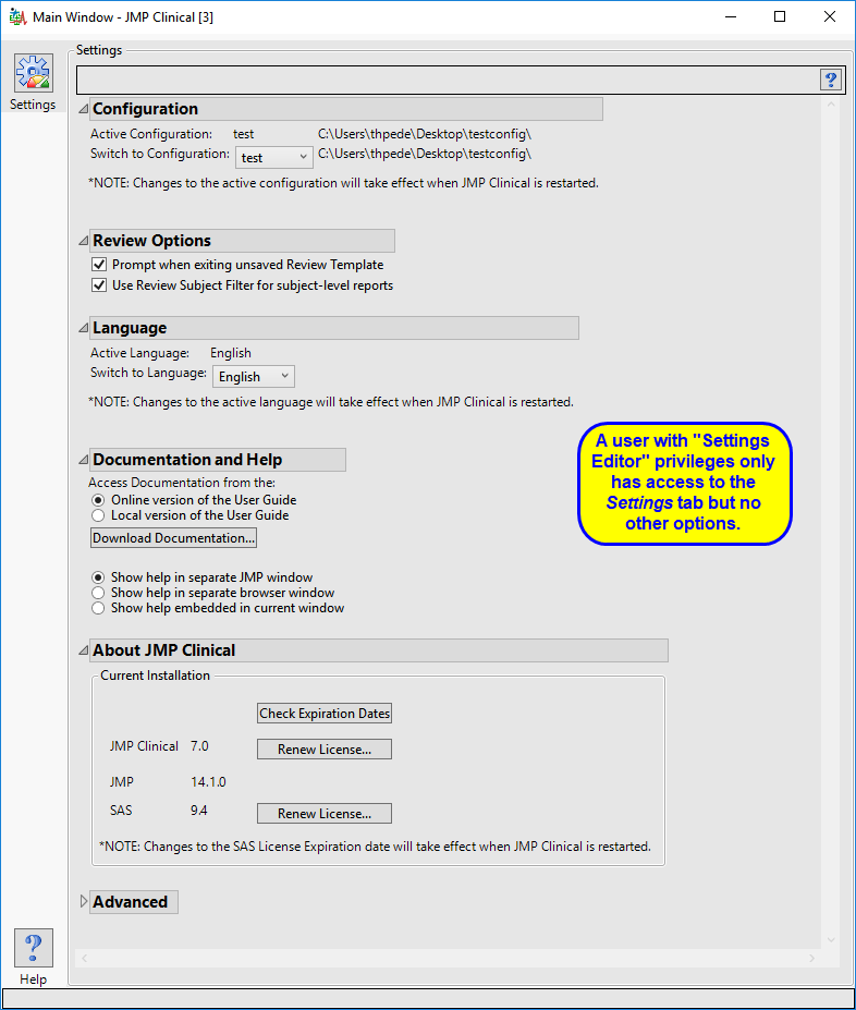JMP Clinical can be configured such that individual users have multiple roles. The Main Window surfaced to those users are permissive and show all the options available for each role.
