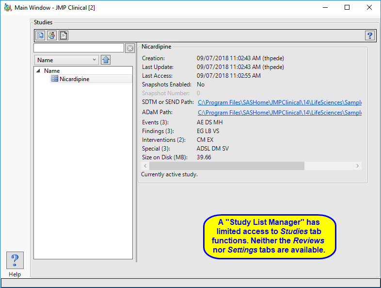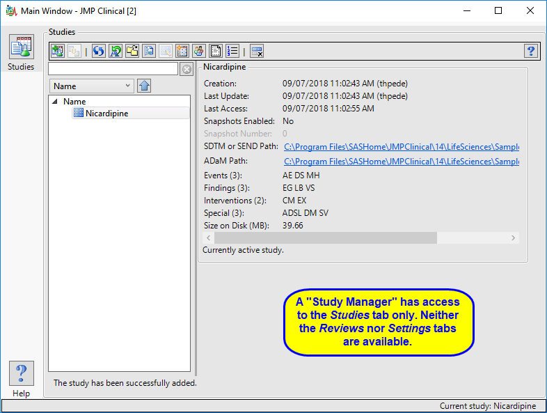 A user with this role can do all of the operations involved in managing studies within JMP Clinical: add, combine, and refresh metadata, rename or move folders, update a review with a new snapshot, update the study risk data set, and delete studies.