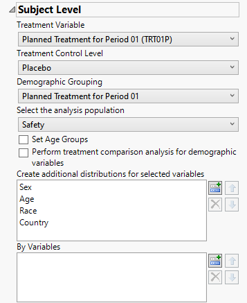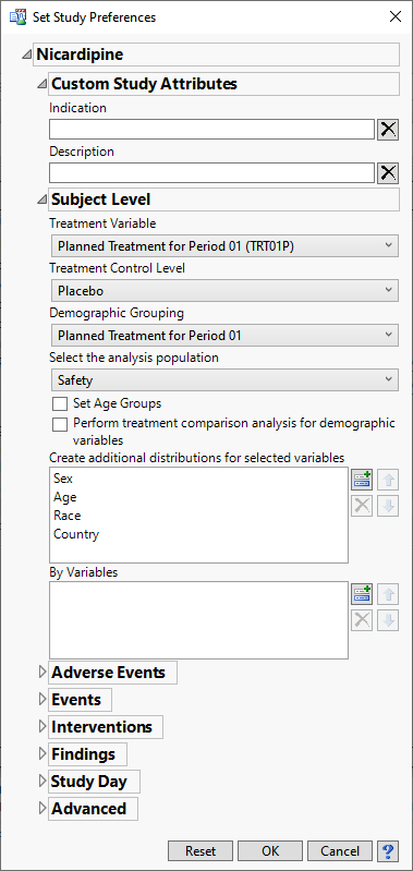 Note: JMP Clinical automatically tries to assign default values for each of the subject level preferences based on flags found in the ADSL, ADDM, or DM (and optionally SUPPDM) data sets as well as prior selections. Use the individual widgets to modify the selections.