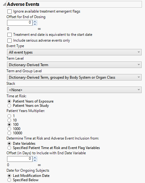 Use the Determine Time at Risk and Adverse Event inclusion from: widget to specify whether JMP Clinical should calculate patient years and event inclusion based on study date variables or from derived patient years/time at risk and event inclusion flags.