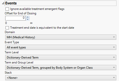 Use the Domain option to specify whether to analyze either disposition (DS) or medical history (MH) events.