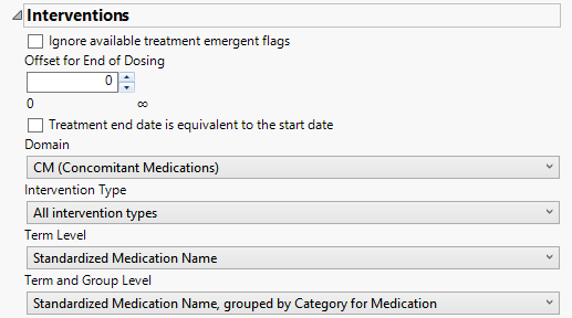 Use the Domain option to specify whether to analyze either concomitant medication (CM) or exposure (EX) interventions.