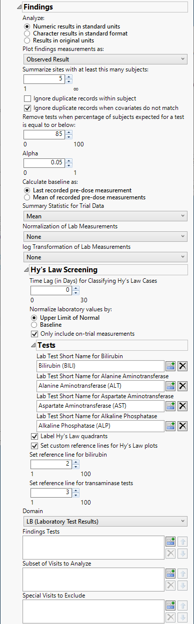 Use the Findings Domain to Analyze option to specify whether to plot the distribution of measurements from either the Electrocardiogram (EG), Laboratory (LB), or Vital Signs (VS) findings domains.