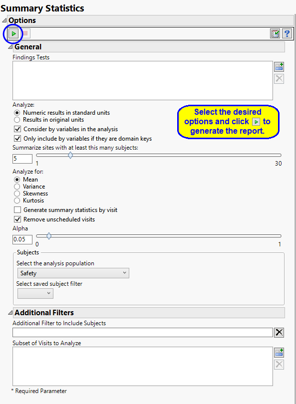 Filters enable you to restrict the analysis to a specific subset of subjects and/or adverse events, based on values within variables. You can also filter based on population flags (Safety is selected by default) within the study data.