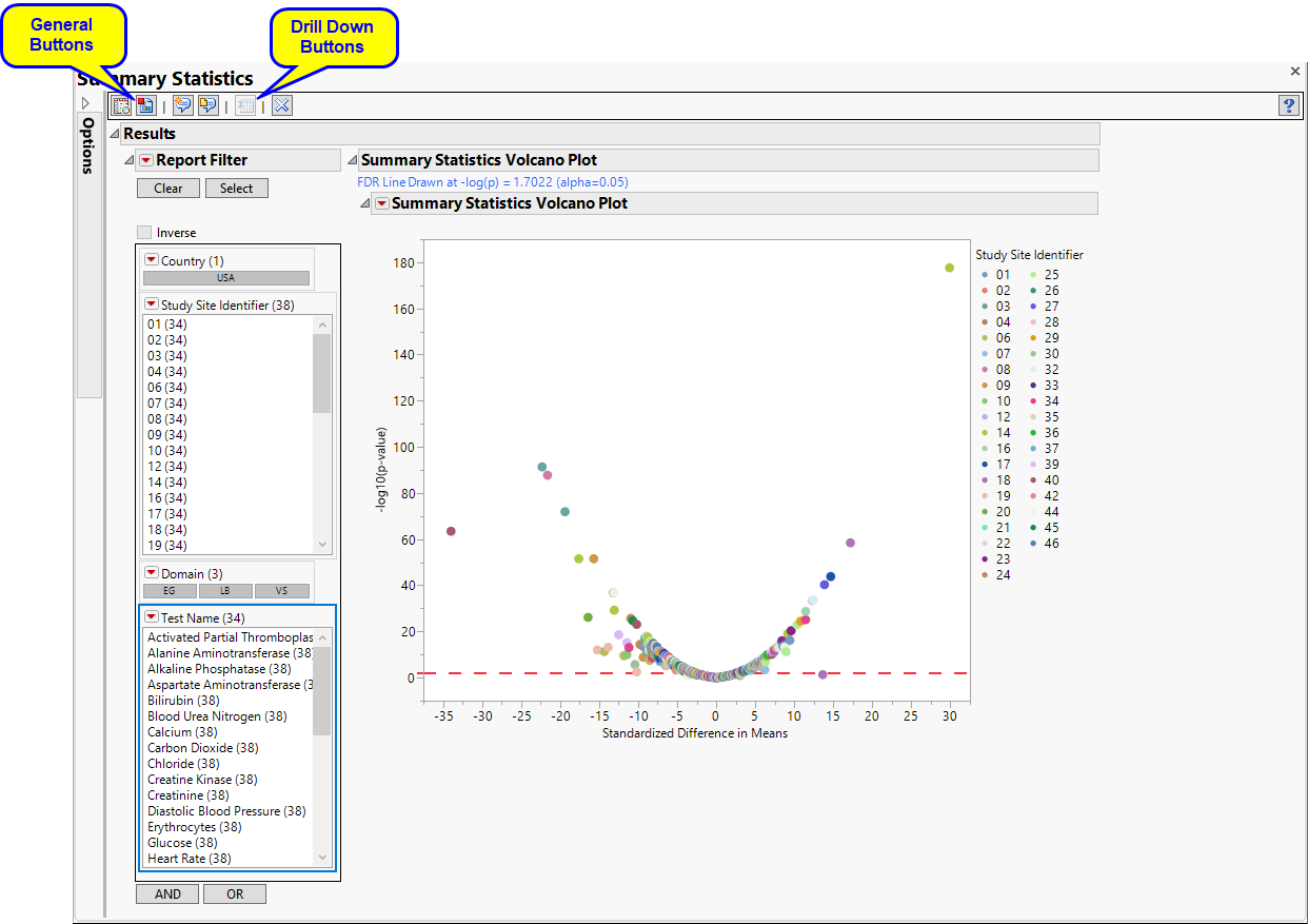 | • | Show Summary Statistics: Shows the rows of the data table for the selected points from the volcano plot (see above) |