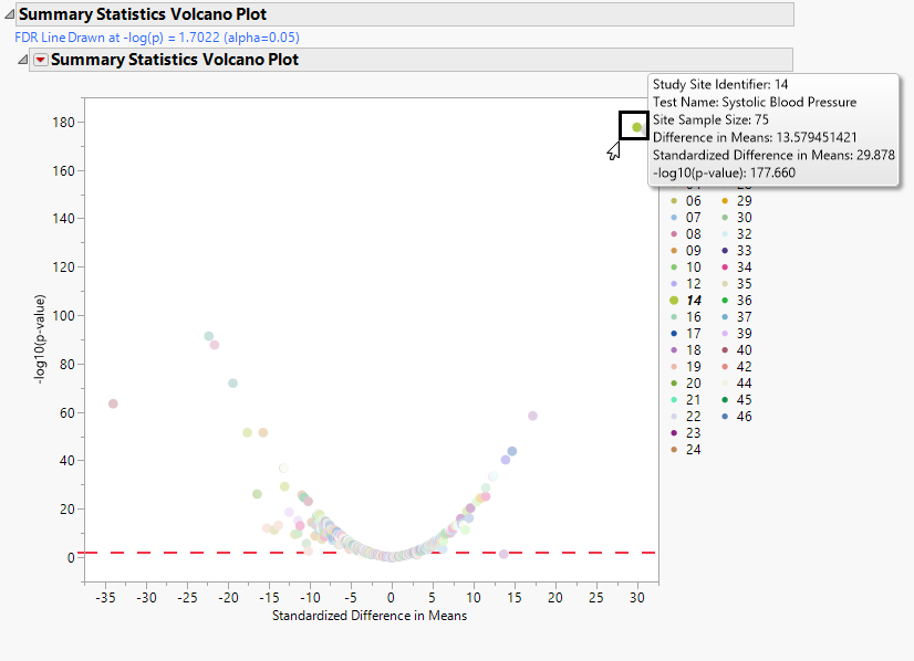 Shows a volcano plot used to determine the deviation of a mean or variance for Findings tests at a site versus other sites. Each point represents a single Findings test for a specific site. Here, the X axis represents the standardized difference in means between each between the site and the reference set (all other sites). For comparisons of variances, the X axis represents the log2(Ratio of Variances) between the site and the reference set.