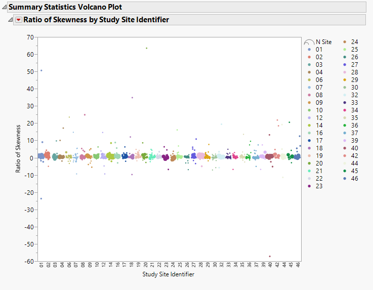 If you specify either Skewness or Kurtosis, you generate a volcano plot similar to that shown below: