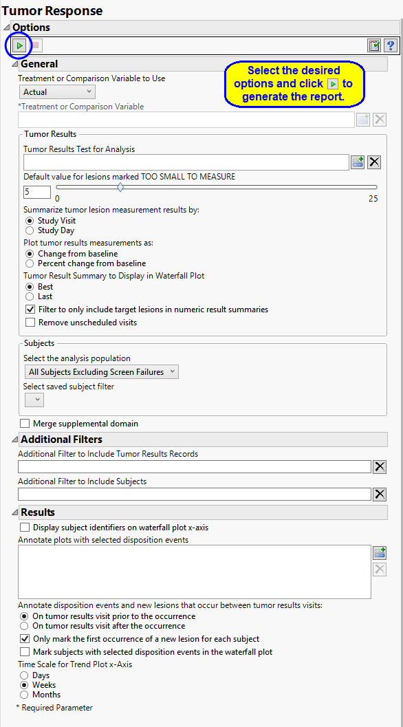 See Select the analysis population, Select saved subject filter3, Merge supplemental domain, Additional Filter to include tumor results records, and Additional Filter to Include Subjects for more information.