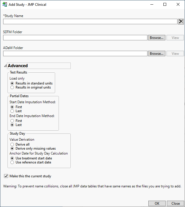 This study management action adds a study (see Studies) from local folders that contain CDISC-formatted data. You must add a study before you can perform the analysis. The data can be submitted as JMP data tables (.jmp files), SAS data sets (.sas7bdat files), SAS Transport Files (.xpt files), or a combination of these.