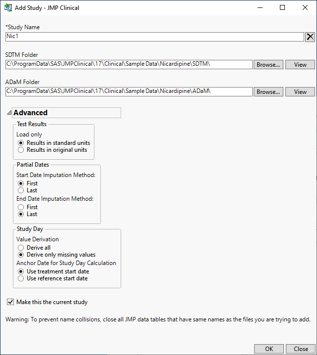 JMP Clinical ships with the data from a Nicardipine study. The data files are located in the Sample Data in your Installation directory (typically C:\ProgramData\SAS\JMPClinical\17\Clinical\Sample Data\Nicardipine for Windows machines and /Library/Application Support/JMP/17/Clinical/Sample Data for MACs). In this example, we add a clinical study we call Nic1.