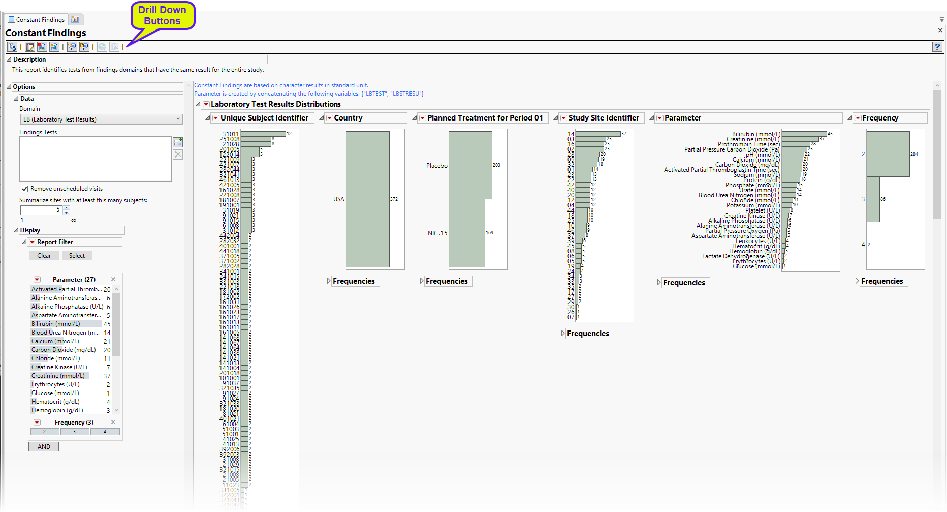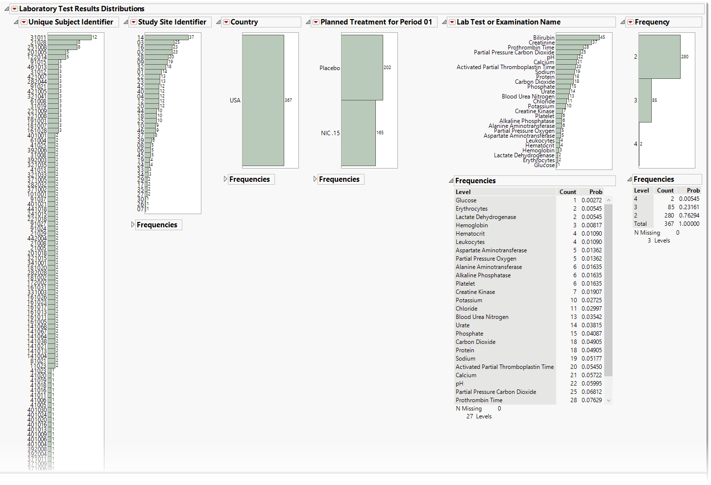 The data table underlying these histograms represent tests that are constant for the duration of the trial. Therefore, Unique Subject Identifier summarizes the number of Lab tests that are constant for each subject. Study Site Identifier shows the frequency of constant tests at each study site. Country summarizes the country of the study site subjects participated at. Test or Examination Name shows the tests that are constant. Treatment Arm is provided to show whether the frequency of constant tests varies based on study treatment.