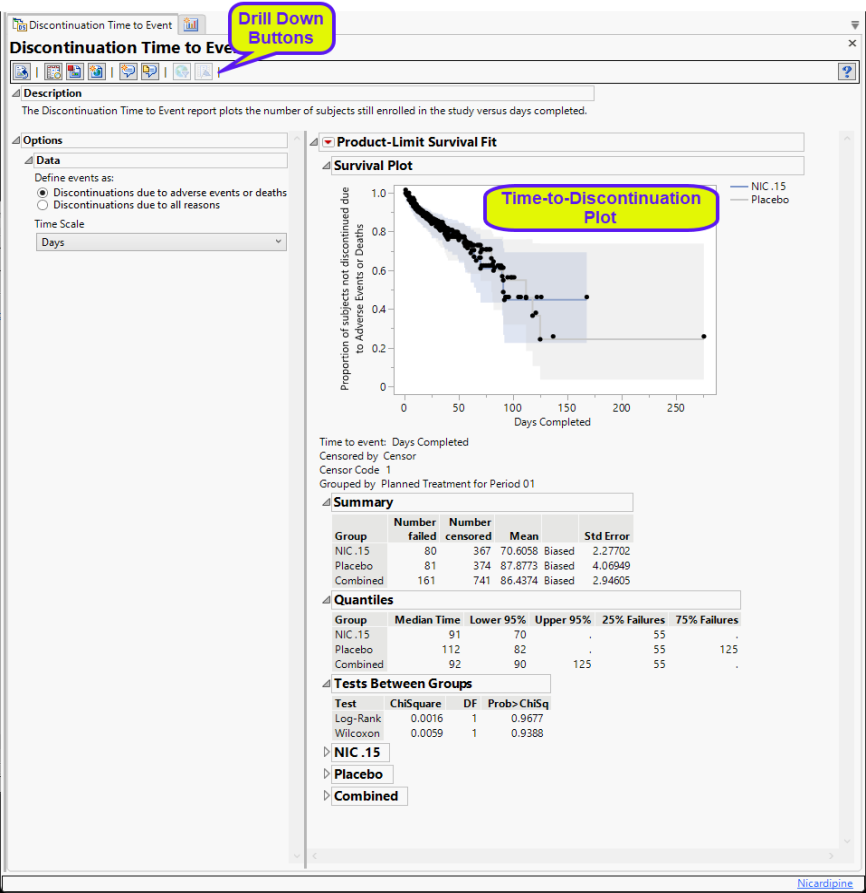 Contains a Kaplan-Meier Survival Curve time-to-event analysis that compares the time until discontinuation of individuals in each treatment arm in the study. Otherwise, subjects are censored when they complete the trial. You can define what constitutes a discontinuation using the Define events as: option in the Discontinuation Time to Event.