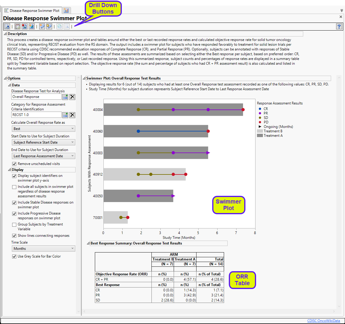 This process creates a disease response swimmer plot and tables around either the best or last recorded response rates and calculated objective response rate for solid tumor oncology clinical trials, representing RECIST evaluation from the RS domain. The output includes a swimmer plot for subjects who have responded favorably to treatment for solid lesion trials per RECIST criteria using CDISC recommended evaluation responses of Complete Response (CR), and Partial Response (PR). Optionally, subjects can be annotated with responses of Stable Disease (SD) and/or Progressive Disease (PD) as well. The results of these assessments are summarized based on selecting either the Best response per subject, based on preferred order: CR, PR, SD, PD for controlled terms, respectively, or Last recorded response. Using this summarized response, subject counts and percentages of response rates are displayed in a summary table split by Treatment Variable based on report selection. The objective response rate (the sum and percentage of subjects who had CR + PR assessment result) is also calculated and listed in the summary table.