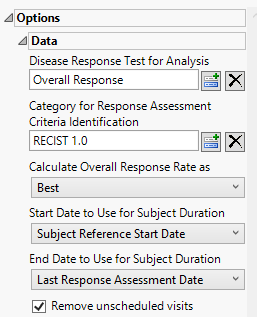 You must specify the start and end dates for collecting data to assess response of patients to the treatments. The Start Date to Use for Subject Durationand End Date to Use for Subject Duration widgets are used to select which variable date reference from the demography domain to use for calculating the response duration.
