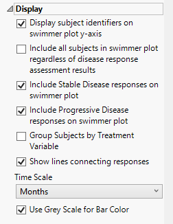 You can opt to display the bars and response markers on the swimmer plot in grey scale by checking the Use Grey Scale for Bar Color widget.