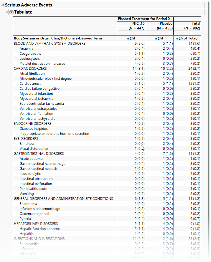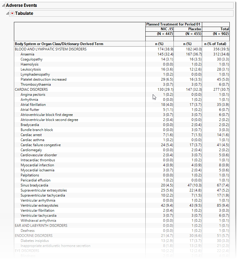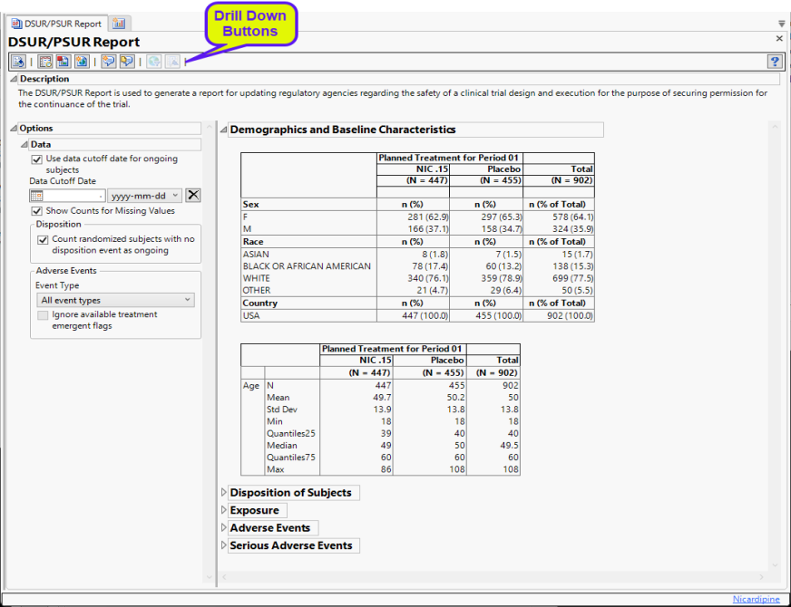 Running DSUR/PSUR Report for the Nicardipine study using default settings, generates the Report shown below.