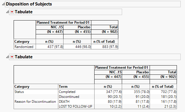 The tables in this section (shown below) summarize disposition information about the subjects in this study. Both count and percentile data are provided for each disposition event broken out by treatment arm.
