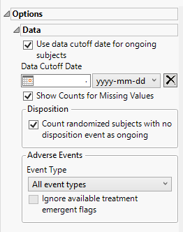 For subjects who are ongoing in the study, it is useful for indicating the date on which the data for this update report was pulled, particularly when considering exposure data. The Use data cutoff date for ongoing subjects and Data Cutoff Date widgets enable you to specify and use a data cutoff date for reporting on ongoing subjects.