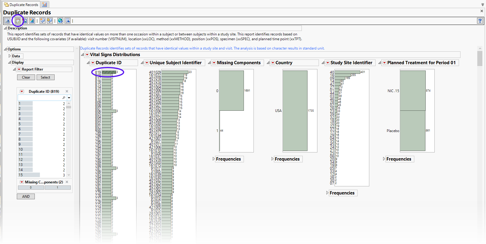 The data table underlying these histograms represents records that have at least one duplicate within or between subjects in the trial (depending on options). Therefore, Unique Subject Identifier shows the number of subject records that occur in duplicate bins. Missing Components helps identify duplicate records with a majority of nonmissing data. For example if ALT, AST, and ALP are analyzed, and for a subject at a certain visit there is no ALT result, then the Missing Component number is 1. Country, Study Site Identifier, and Planned Treatment are provided to show where these duplicates occur most frequently.