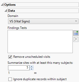 Use this widget to specify whether to plot the distribution of measurements from either the Electrocardiogram (EG), Laboratory (LB), or Vital Signs (VS) findings domains.