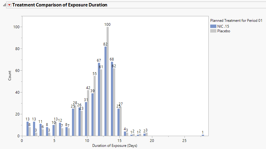 A histogram showing Exposure Duration calculated by summing the number of doses over study day by subject.